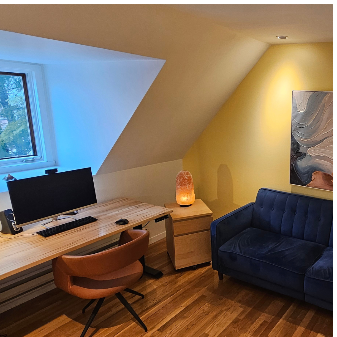 Situé au 2e étage également, ce bureau fermé offre un cadre élégant et reposant, idéal pour vos besoins professionnels. Il est équipé d’un divan-futon bleu en velours, combinant confort et style, pour une atmosphère apaisante propice à la réflexion ou aux échanges créatifs. L’espace est également équipé d’un Wi-Fi rapide, parfait pour vos réunions virtuelles ou toute session de travail nécessitant une concentration optimale. Disponible à la location à l'heure, en demi-journée ou pour une journée complète, cet espace flexible s’adapte à vos besoins. Que vous souhaitiez avancer sur vos projets, organiser une réunion ou simplement prendre du temps pour réfléchir, ce bureau vous offre un environnement inspirant et confortable pour maximiser votre efficacité.